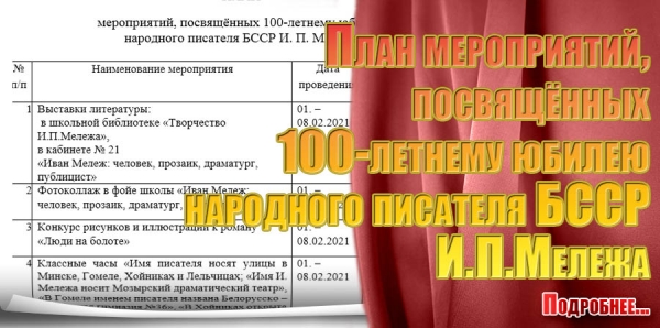 | 4. | Классные часы «Имя писателя носят улицы в Минске, Гомеле, Хойниках и Лельчицах; «Имя И. Мележа носит Мозырский драматический театр», «В Гомеле именем писателя названа Белорусско – славянская гимназия №36», «В Хойниках открыта скульптурная композиция «По страницам произведений И. Мележа» | 01. – 08.02.2021 | Классные руководители 8-11 классов |