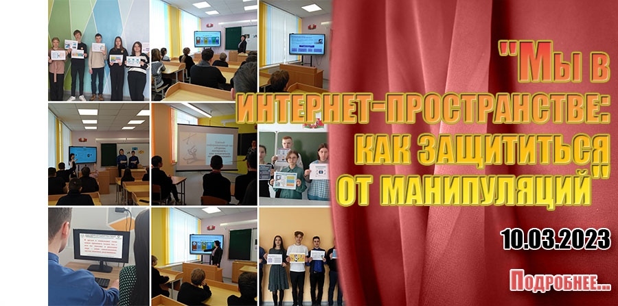 С учащимися 7-11 классов Средней школы №4 г.Речицы проведен единый информационный час "Мы в интернет-пространстве: как защититься от манипуляций". Инициативная группа учащихся 11 класса выступили с информацией об опасностях,которые поджидают нас в интернет пространстве. Информационный контент выступления и презентации, подготовленной Национальным институтом образования, вызвал живой интерес и стал импульсом к дискуссии на тему психологических манипуляций в сети Интернет.
