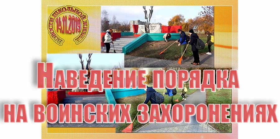 Учащиеся школы традиционно принимают участие в акции по наведению порядка на воинских захоронениях  и памятниках воинской славы. Так, 14.11.2019 учащиеся IX «В» класса во главе с классным руководителем Герус О.В.    в рамках подготовки к празднованию 76-летия освобождения г.Речицы и Речицкого района от немецко-фашистских захватчиков навели порядок на  территории памятника воинам-интернационалистам: собрали мусор, сгребли листья, очистили постамент и цветник , подмели дорожку.